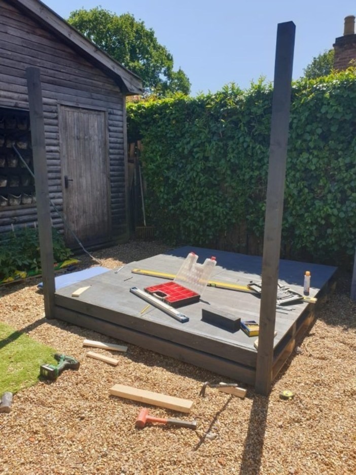 For at tilføje charme borede hun små huller i bjælkerne og hængte lanterne-lignende lys op. Rammen og fundamentet blev malet i en blød grå nuance, hvilket gav konstruktionen et moderne look.