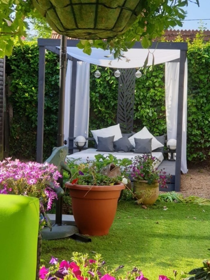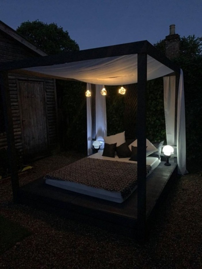 Da malingen var tør, satte Tanya en seng op indeni ved hjælp af en gammel madras, som hun dækkede med et vandtæt DIY-betræk lavet af det samme stof, som hun brugte til pudebetræk. Som prikken over i’et draperede hun stof over pavillonen, hvilket skabte en elegant atmosfære, der så ud som taget ud af et magasin.