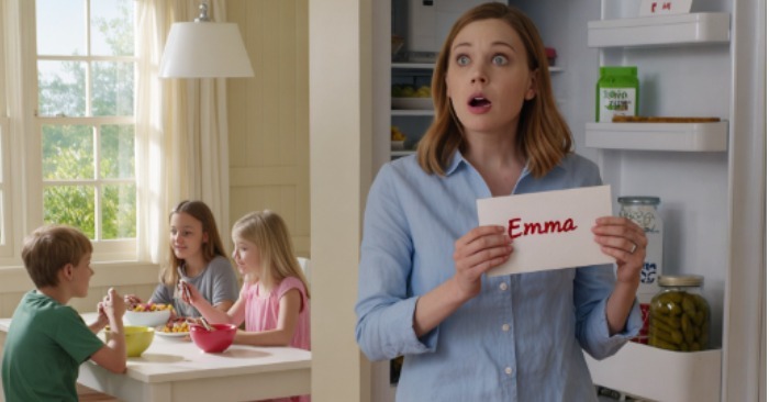 Det skulle have været en helt almindelig morgen. Emma, en ung mor til to børn, gik halvt søvnig ind i køkkenet og åbnede køleskabet for at hente mælk til sine børns morgenmad. Men i det øjeblik døren svingede op, frøs hun fast.