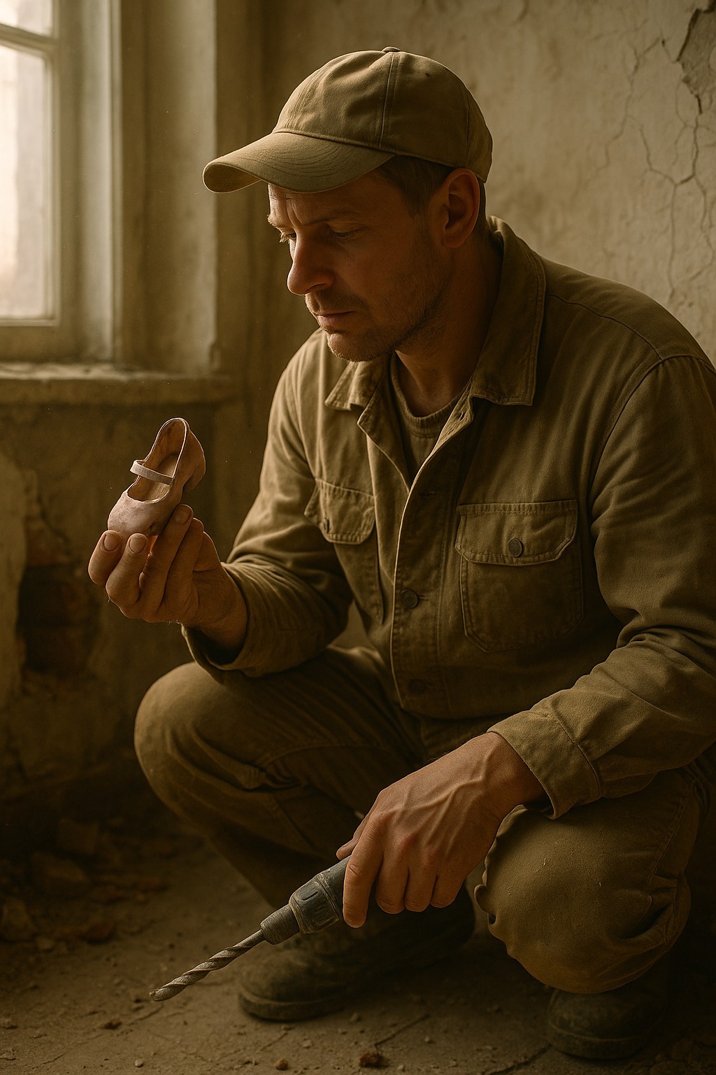 Arbejderne begyndte deres dag som sædvanligt: lyden af en boremaskine, lugten af støv, smuldrende puds. Men tættere på middag stoppede en af håndværkerne, Adam, pludselig. Boremaskinen havde uventet givet efter – der var et hulrum bag murstenen.