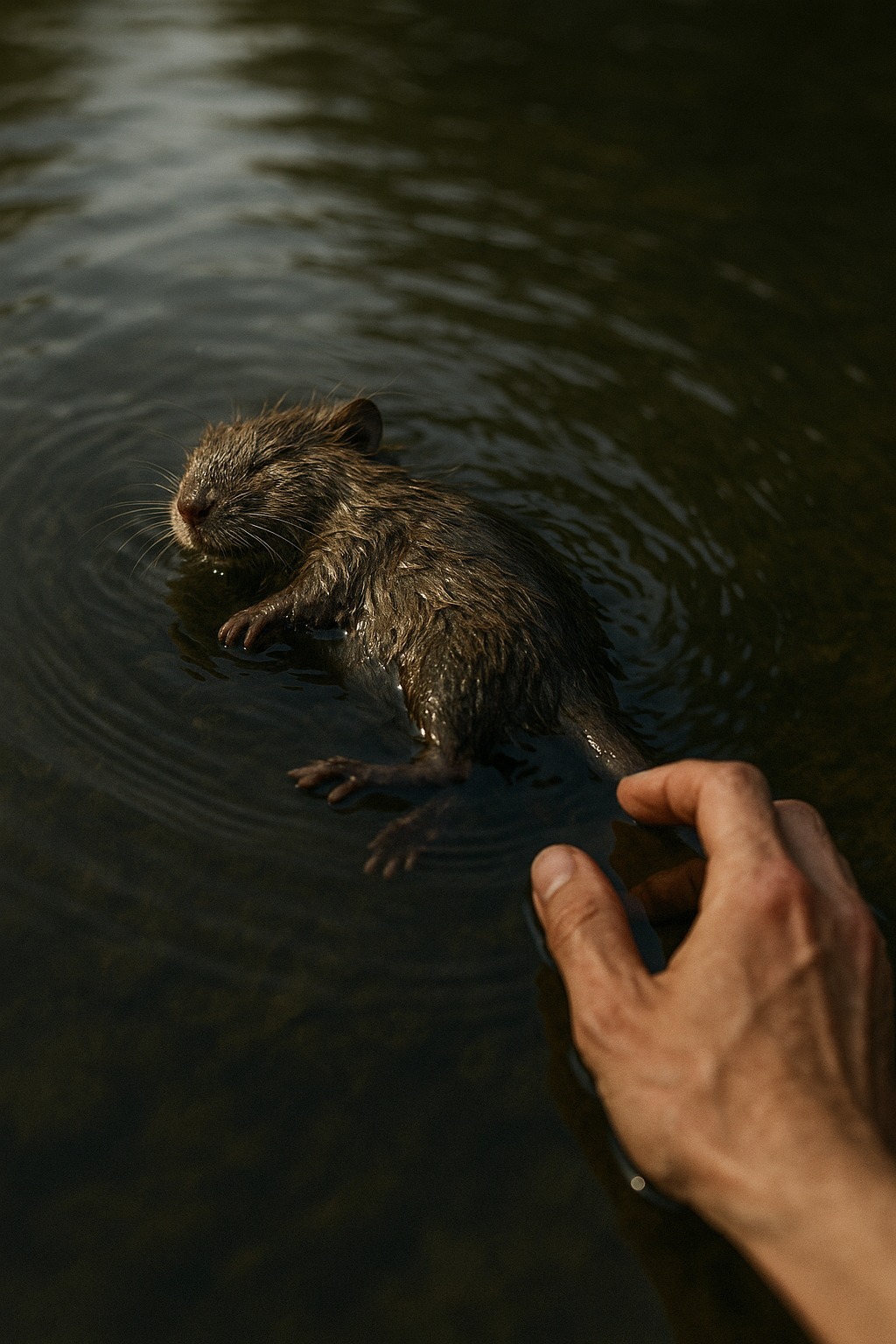 Den aften var alt som sædvanligt. Floden glitrede i den nedgående sol, guldsmede summede over sivene, og Maria var lige ved at gå, da noget blinkede mellem bølgerne. En lille pelsbold hvirvlede rundt i strømmen. Først troede hun, at det bare var affald eller et kasseret legetøj, men så hørte hun en svag knirken.
