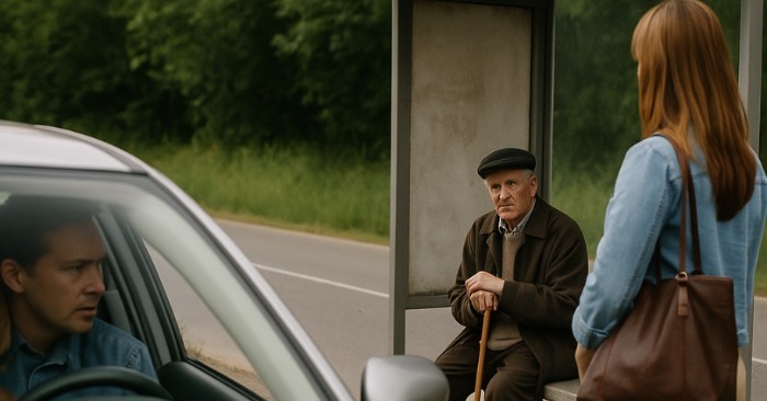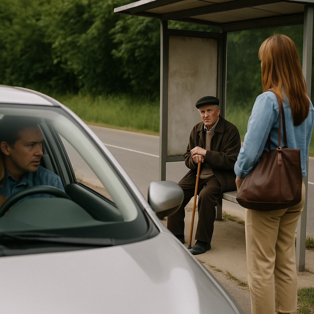 Da de kørte forbi, vendte manden sig roligt om og så efter dem — med et mildt smil, som om han genkendte dem.