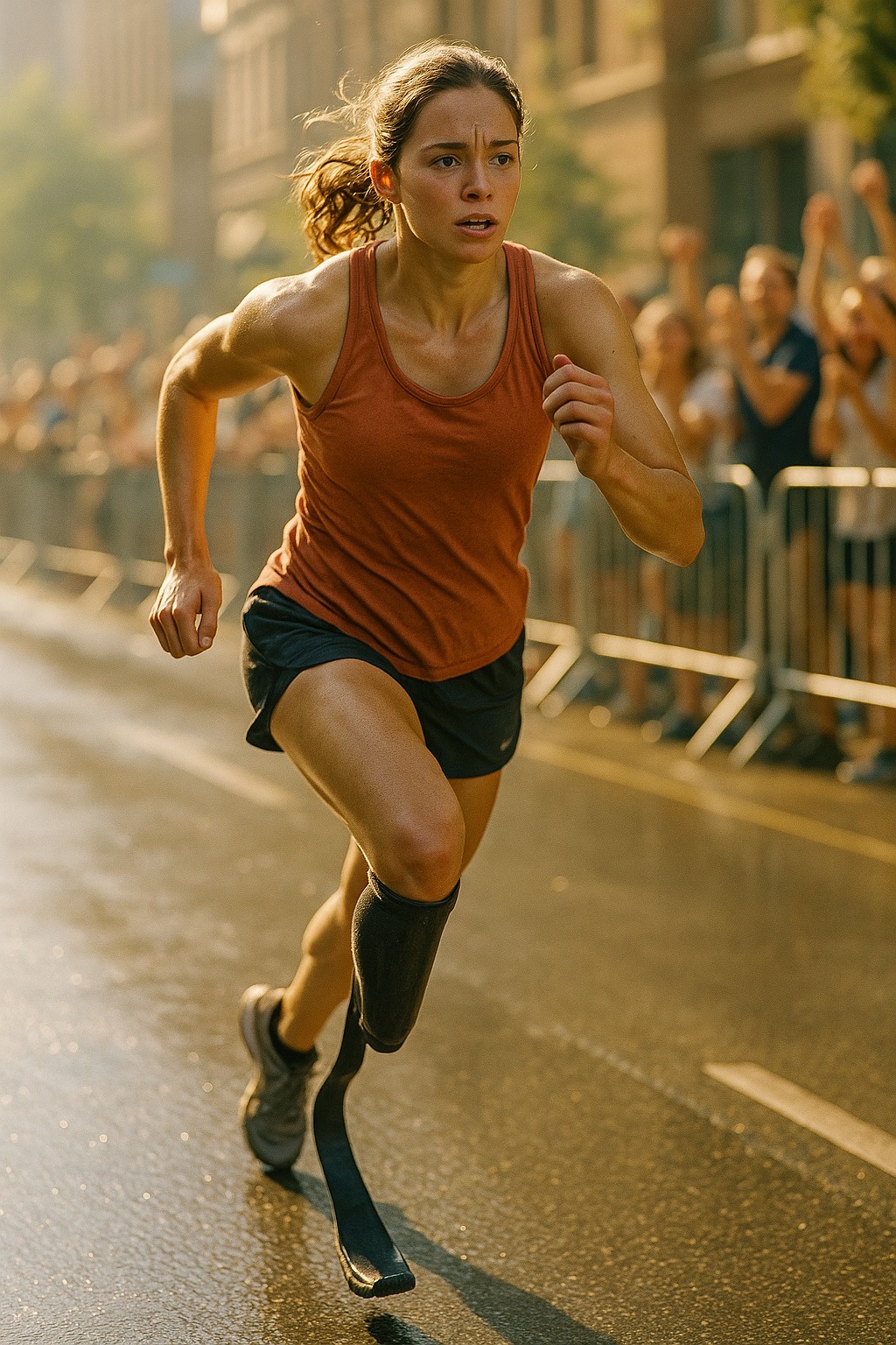 Månederne med genoptræning var et helvede. Hun lærte at gå igen, faldt, ødelagde protesen, græd af smerte og vrede. Men en dag så hun et foto fra et tidligere løb — sig selv smilende ved målstregen — og sagde: