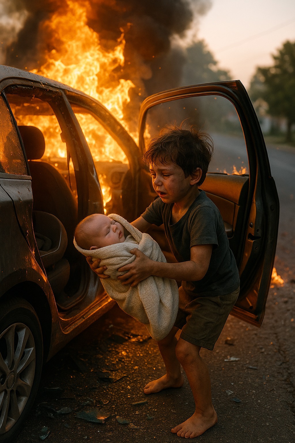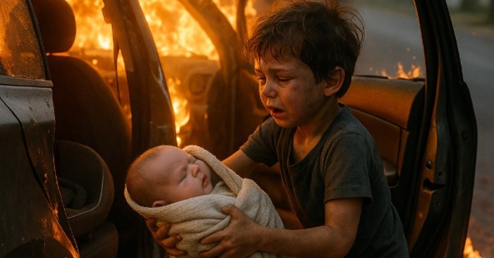 Med al den styrke, en femårig dreng kunne samle, pressede han døren op, greb sin lille søster og kom ud af bilen. Hans små ben rystede, hjertet bankede hårdt – men han vidste, at han skulle løbe væk fra ilden.