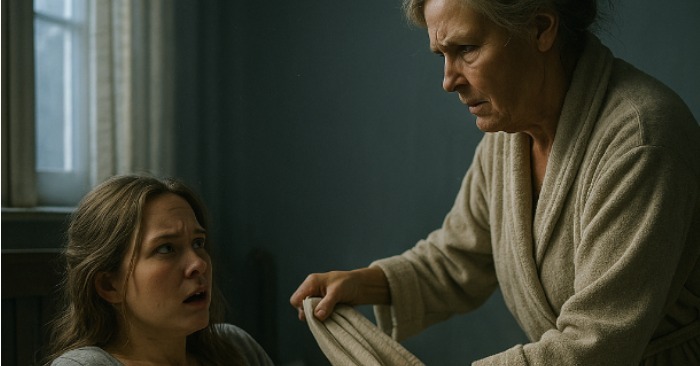 Emma fór sammen af kulden og det skarpe lys. Klokken var 06:02. Dynen lå allerede på gulvet, og over hende stod svigermoren – Margaret – med hænderne i siden. Hendes stemme var kold og hård som metal: