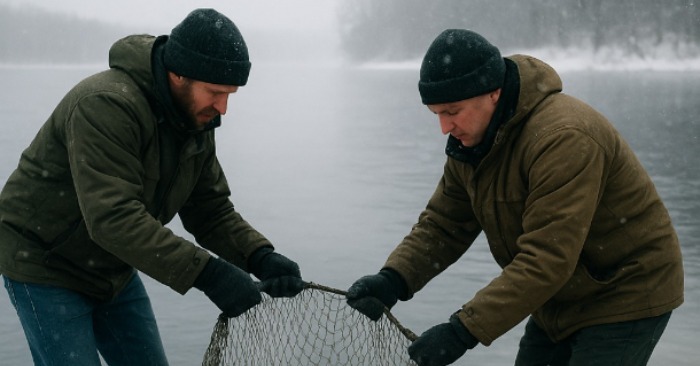 Men pludselig — et plask! Vandet begyndte at boble, og da vi løftede nettet, lå der en stor fisk i det. Den sprællede, men Pasha lagde sin kasket over den og holdt fast.