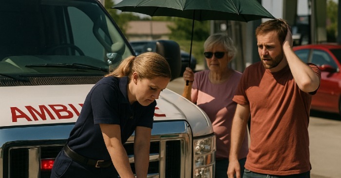 Det var en varm dag. Asfalten nærmest smeltede, luften dirrede over vejen, og selv ambulancens sirener lød mere dæmpede end normalt. Mandskabet var på vej tilbage efter en udrykning – en helt almindelig vagt, intet særligt. Chaufføren besluttede at køre ind på en tankstation: der var kun brændstof tilbage til et par kilometer mere.