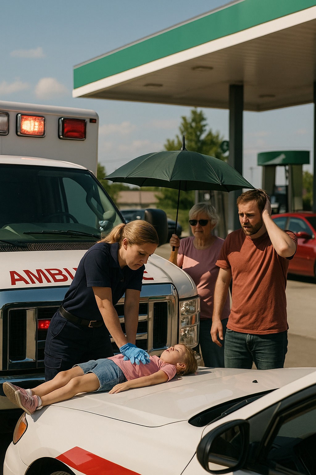 Mens han tankede, gik ambulanceredderen ud for at strække benene, tog en flaske vand fra køleren ved kassen og var på vej tilbage mod bilen. Alt virkede helt hverdagsagtigt – indtil en mand pludselig løb ud af bilen ved siden af. Oprørt, forvirret, med en lille pige i armene.