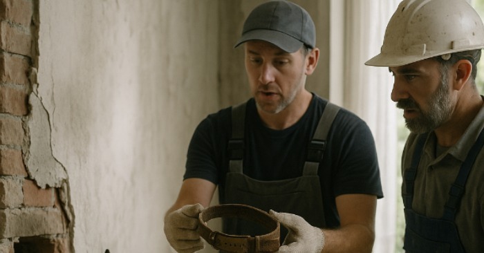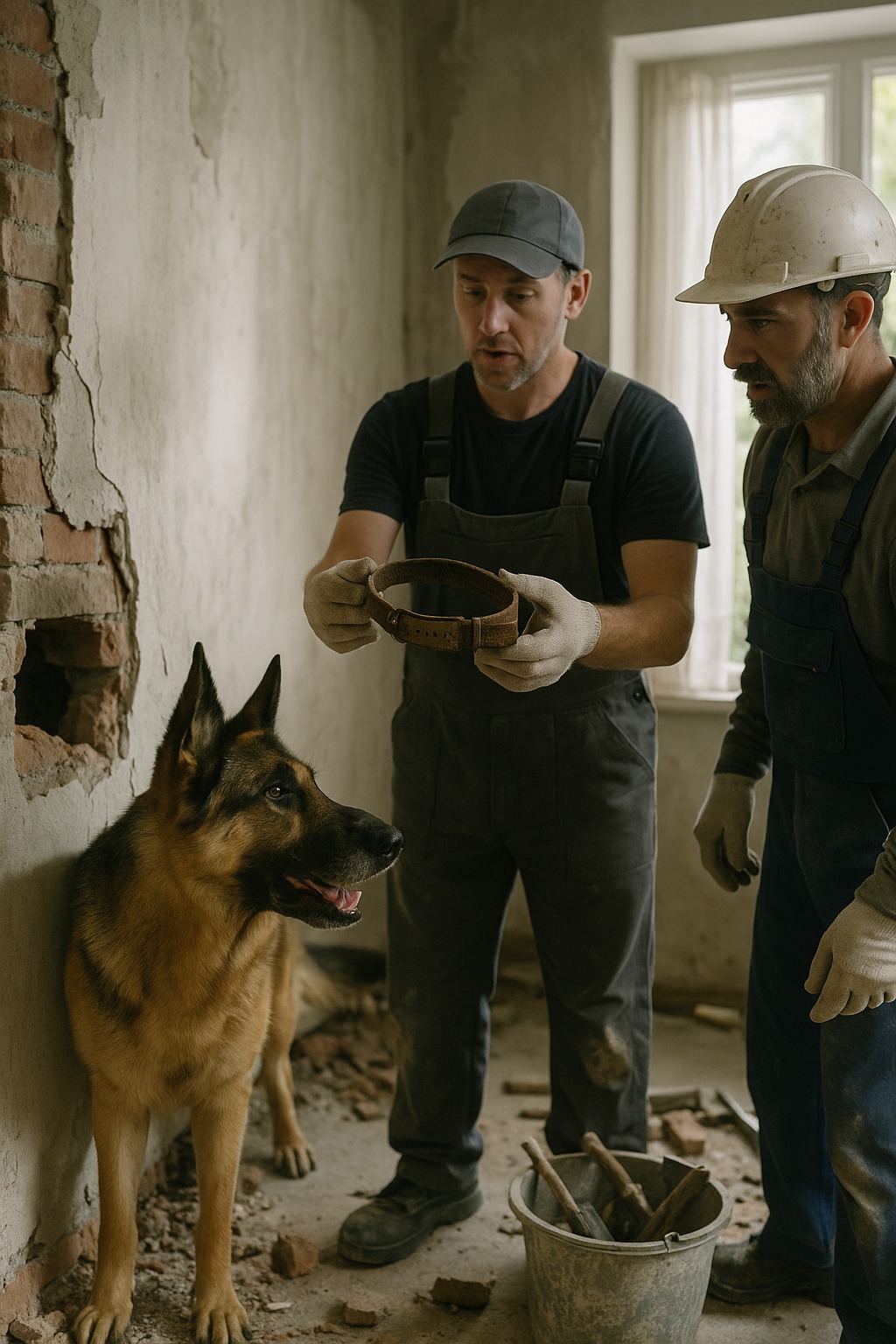 Et gammelt hundehalsbånd blev trukket frem under et lag mursten. Den var dækket af støv, men graveringen på metalpladen var tydeligt læselig: