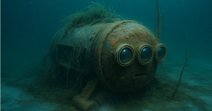 Under et lag af silt lå en cylindrisk genstand på størrelse med en lille bil. Dens krop var dækket af ribbede plader og rustne nitter, og på siden var et emblem – tre tandhjul indskrevet i en cirkel.