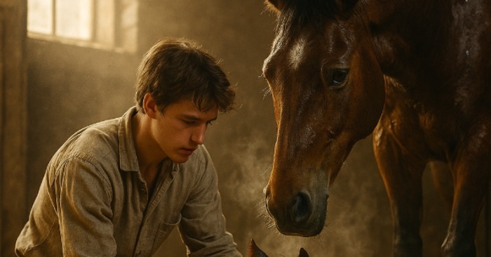 Lukas stod ved Stjernes side, strøg hendes varme hals og hviskede beroligende ord. Dyrlægen og assistenten trak i føllet, hoppen rystede, luften var tung af damp og blod. Endelig – en svag lyd. Et lille, vådt føl lå i halmen. Men det trak ikke vejret.