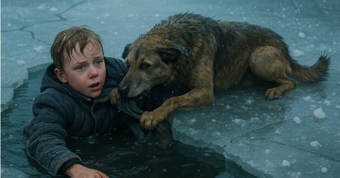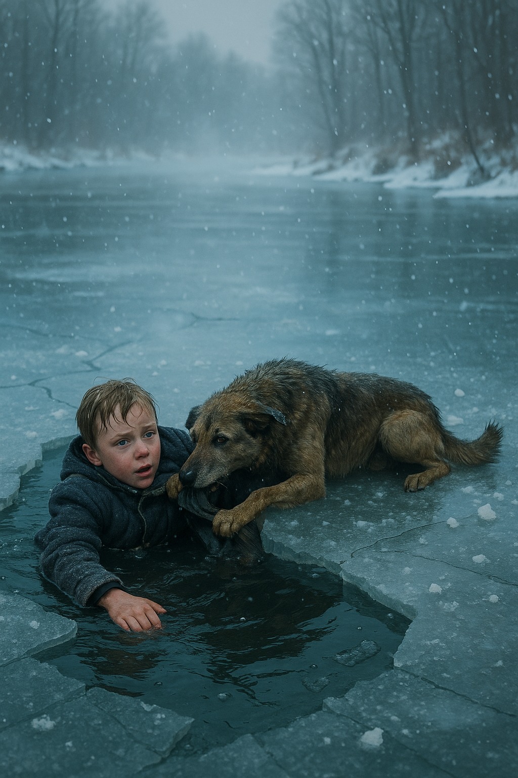 Den lagde sig fladt ned for ikke at bryde igennem — og krøb frem. Nåede kanten af vågen. Drengen bevægede sig næsten ikke længere. Hunden greb fat i hans jakke med tænderne. Trak. Skred tilbage. Trak igen.