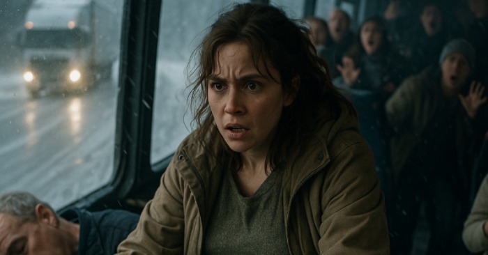 De første tyve minutter gik som sædvanligt — tæt trafik, let sne, grå tåge over vejen. Men da bussen nåede ud på landevejen, skete noget, ingen var forberedt på.