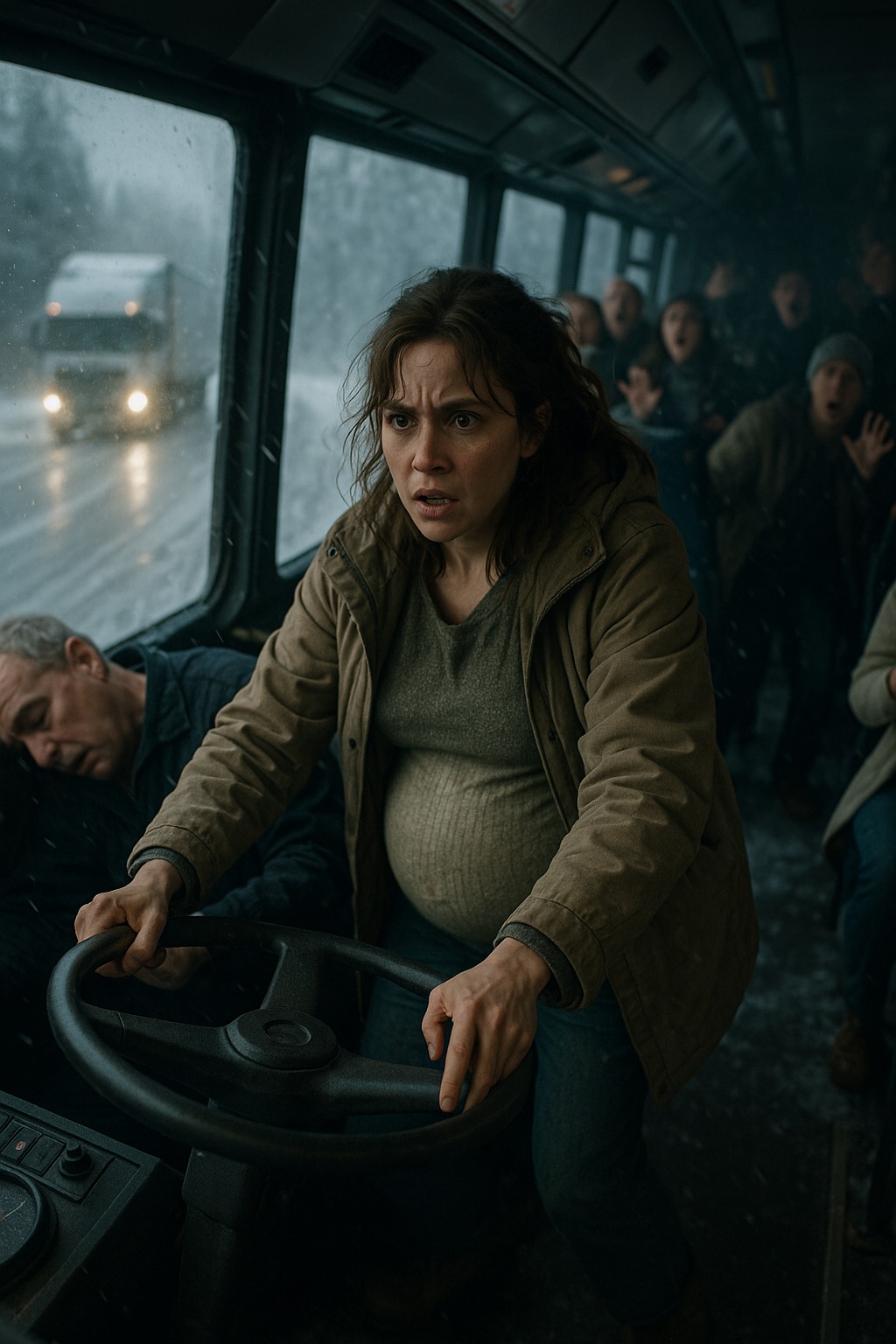 Hun greb rattet med begge hænder — tungt, koldt. Bussen gled allerede over mod modkørende bane, en lastbil nærmede sig forude. Hjertet hamrede. Nogle græd, andre bad.
