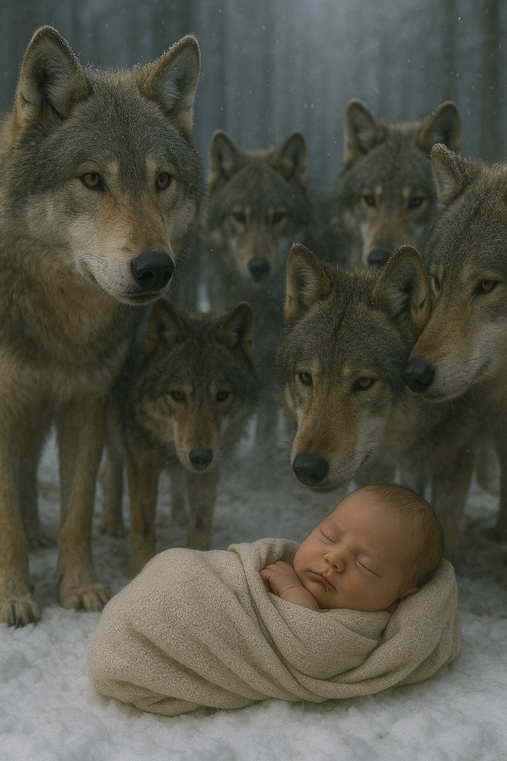 Luna nærmede sig og puffede forsigtigt til det med sin snude. Lugten var ukendt, men mærkeligt varm. Barnet rørte sig, og et svagt pip ekkoede over den snedækkede lysning. Hunulven lagde sig ned ved siden af det og beskyttede det mod vinden med sin krop. De andre ulve stod i en halvcirkel og dannede en levende mur.