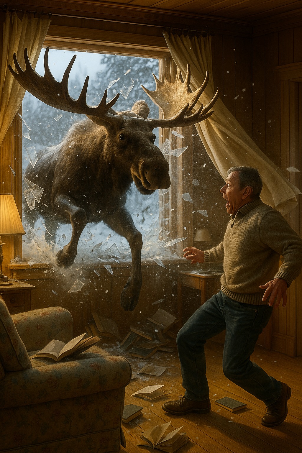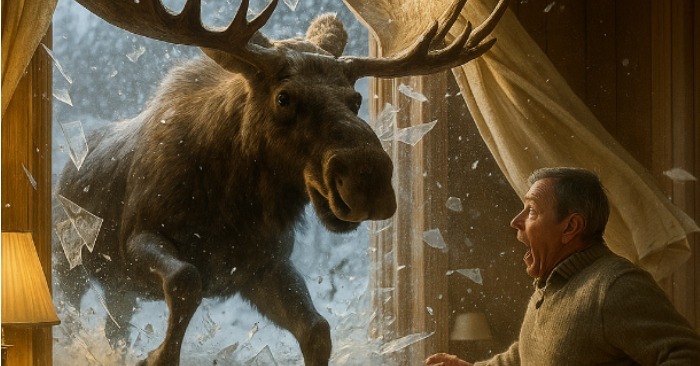 Manden sprang tilbage, spildte sin te og væltede sin lænestol. Foran ham stod en elg – en rigtig, voksen, massiv elg. Blændet af lampens lys løb den rundt i stuen, stødte ind i møblerne og væltede gardinerne. Scenen var som taget ud af en drøm: sne faldt indenfor, bøger fløj rundt, tallerkener klirrede, og et kæmpe vildt dyr løb hen over gulvet uden at forstå, hvor det var.