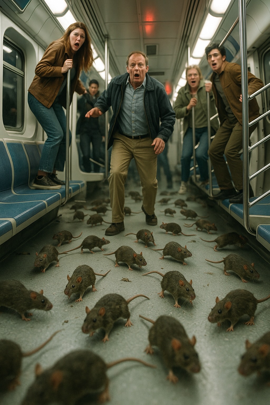 Nogen skreg, nogen hoppede op og ned på stedet. Men det var ikke slutningen. Snesevis af grå kroppe begyndte at dukke op fra sprækkerne mellem sæderne, fra under gummipakningerne, fra hjørnerne. Rotter. Små, store, skinnende af fugt, med lange haler, der raslede med poterne på linoleumsgulvet.