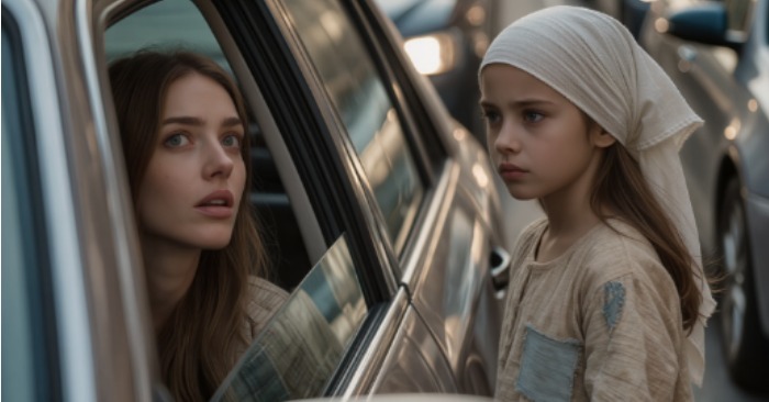 Udenfor stod en lille pige. Hun var ikke mere end fem eller seks år. Helt gennemblødt, iført en gammel frakke, med to fletninger — den ene halvt gået op. Hun så direkte på mig — roligt, uden frygt, som om hun vidste, hvem jeg var.