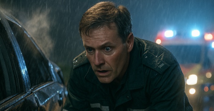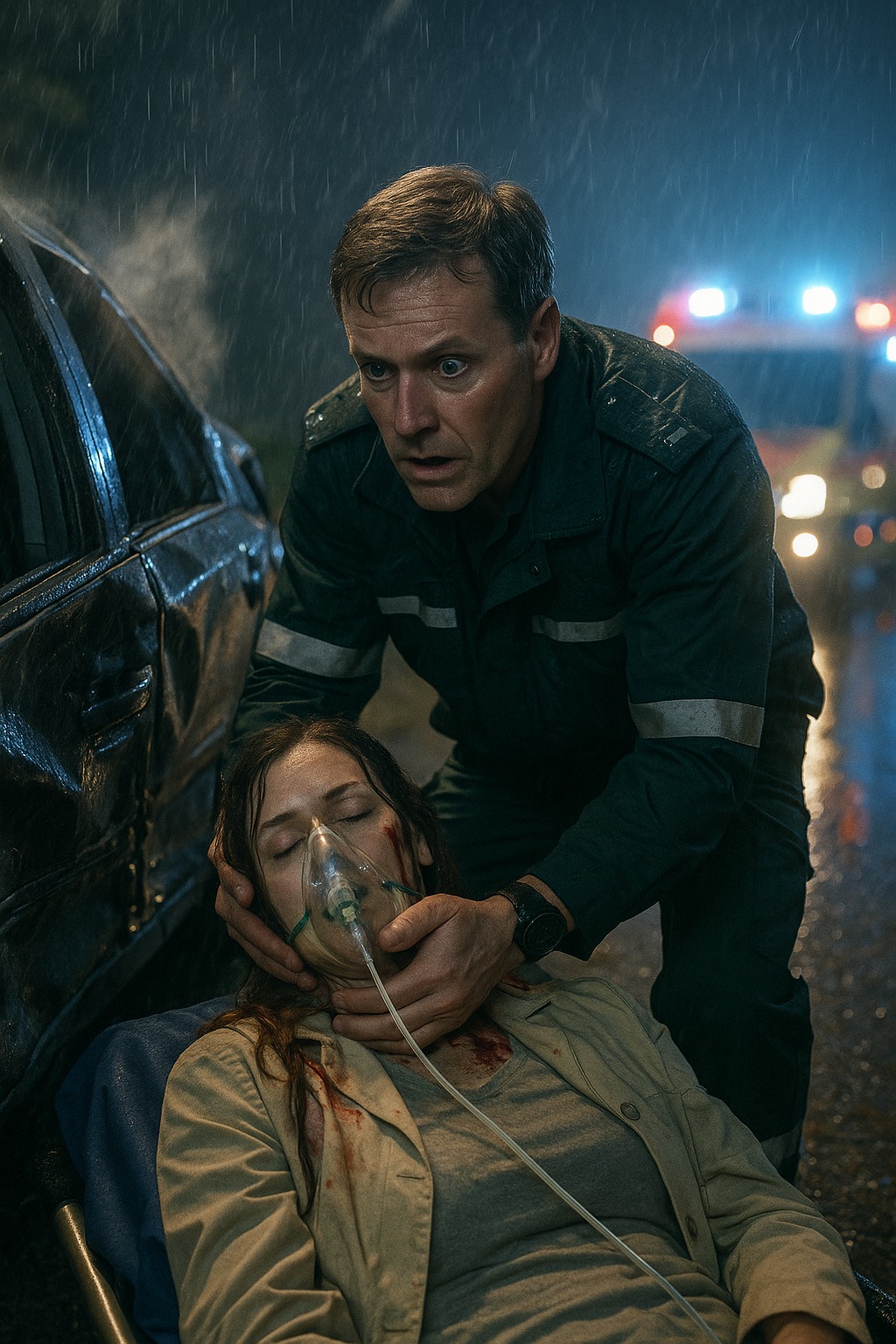 Tyve minutter senere var de fremme. Bilen lå i grøften, fuldstændig smadret, damp steg op under motorhjelmen. Mark løb hen til døren, trak kvinden ud — ung, dækket af blod og glassplinter. Puls svag, vejrtrækning uregelmæssig. Han arbejdede automatisk: stabilisere, iltmaske, støtte nakke. Alt som altid.