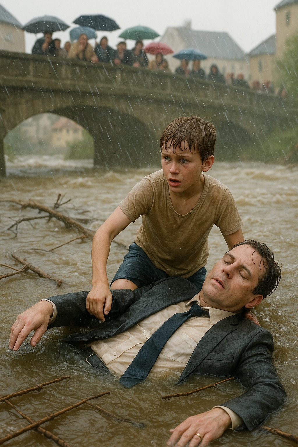 Foråret bragte et pludseligt skybrud over byen. Den rolige, klare flod forvandlede sig til en brølende strøm. Vandet bar grene, skrald og alt, hvad der kom i vejen. Folk stod på broen under paraplyer og så ned med uro: strømmen var så stærk, at selv en voksen ikke ville kunne stå imod i mere end et minut.