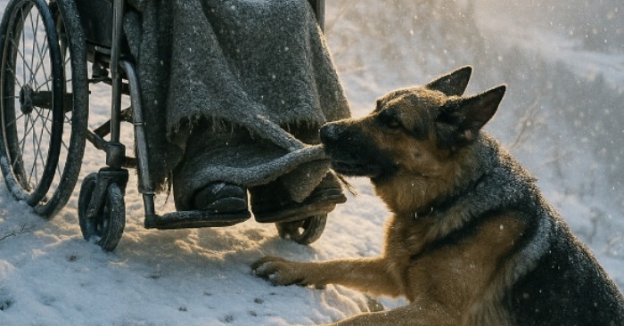 Rex reagerede øjeblikkeligt. Han sprang frem, greb kanten af det uldtæppe, der lå over hende, og trak med al sin kraft bagud. Tæppet gled, stolen vippede — men hunden gav ikke slip. Han knurrede, spændte hver muskel, kradsede i jorden med kløer, der efterlod dybe furer.
