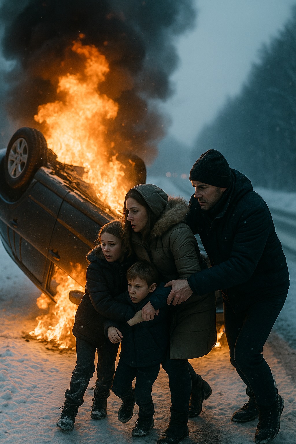 Aleksej sprang ud uden at tænke. Ilden brændte i ansigtet, benzinlugten stak i næsen. Inde fra kabinen lød skrig. Han løb frem — døren var fastklemt, metallet vredet. Indeni — en mand, en kvinde og to børn. Den yngste, måske tre år, græd, næsten uden luft.