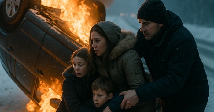 Aleksej sprang ud uden at tænke. Ilden brændte i ansigtet, benzinlugten stak i næsen. Inde fra kabinen lød skrig. Han løb frem — døren var fastklemt, metallet vredet. Indeni — en mand, en kvinde og to børn. Den yngste, måske tre år, græd, næsten uden luft.