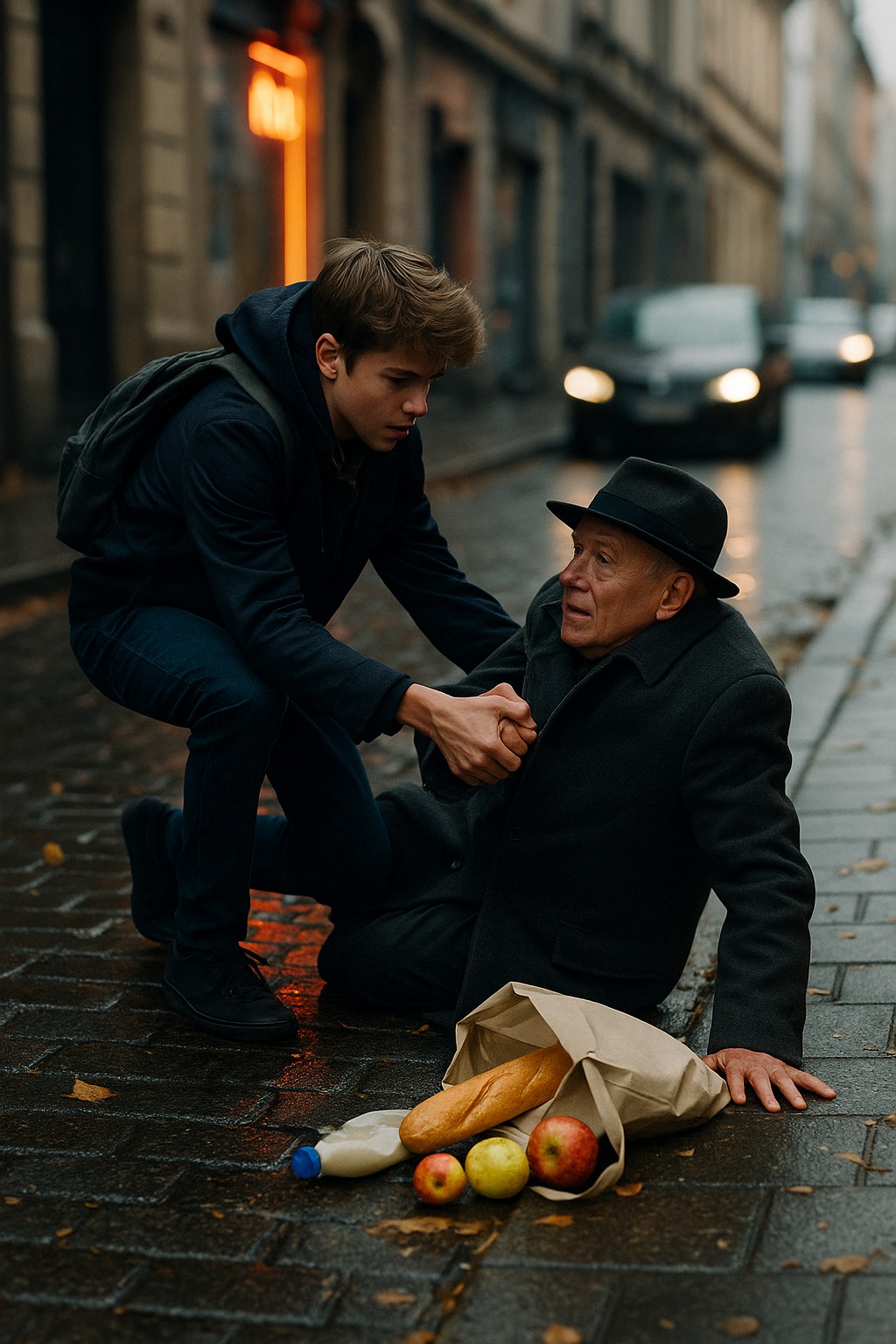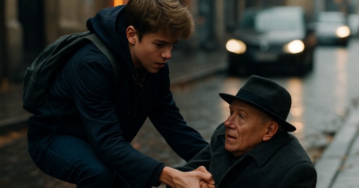 Ikke langt fra busstoppestedet var en ældre mand faldet. Hans taske gled ud af hånden, varerne rullede ud på fortovet. Folk gik forbi — nogle sendte et hurtigt blik, andre så væk. Kun drengen tog høretelefonerne af, gik hen og hjalp ham op.