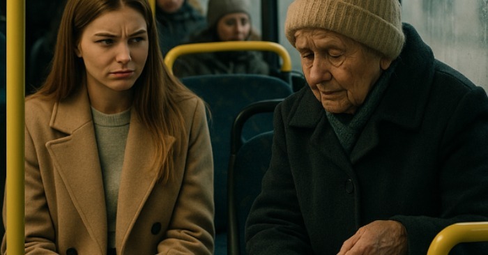 Ved det næste stoppested åbnes dørene, og en ældre kvinde stiger langsomt ind i bussen. Hun er lille, foroverbøjet, iført en gammel frakke og en strikket hue, med en netpose i hænderne. Hendes fingre er røde af kulde. Hun betaler sin billet med småmønter og tæller omhyggeligt hver eneste mønt.