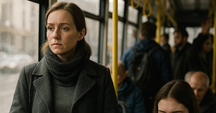 Emma sad ved vinduet med hovedtelefoner på og kiggede på sin telefon. Musikken overdøvede støjen, og hun lagde næsten ikke mærke til, hvad der foregik omkring hende. Ved det næste stoppested steg en kvinde på – omkring 35 år gammel, iført en lang frakke og med en tydelig rund mave.