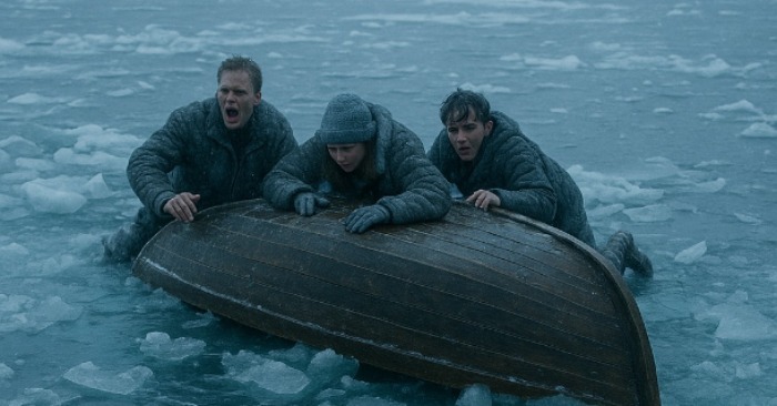 Vandet trak dem ned under isflagerne, og snart var det eneste, de kunne holde fast i, bådens væltede skrog. De klamrede sig til det, skælvende, med fingrene, uden længere at kunne mærke deres hænder. Isflager klæbede sig fast til deres hår, øjenvipper og tøj. Deres kroppe blev gradvist følelsesløse – først fingrene, så fødderne og derefter alt andet. Deres skrig blev til hæsende hvæselyde.