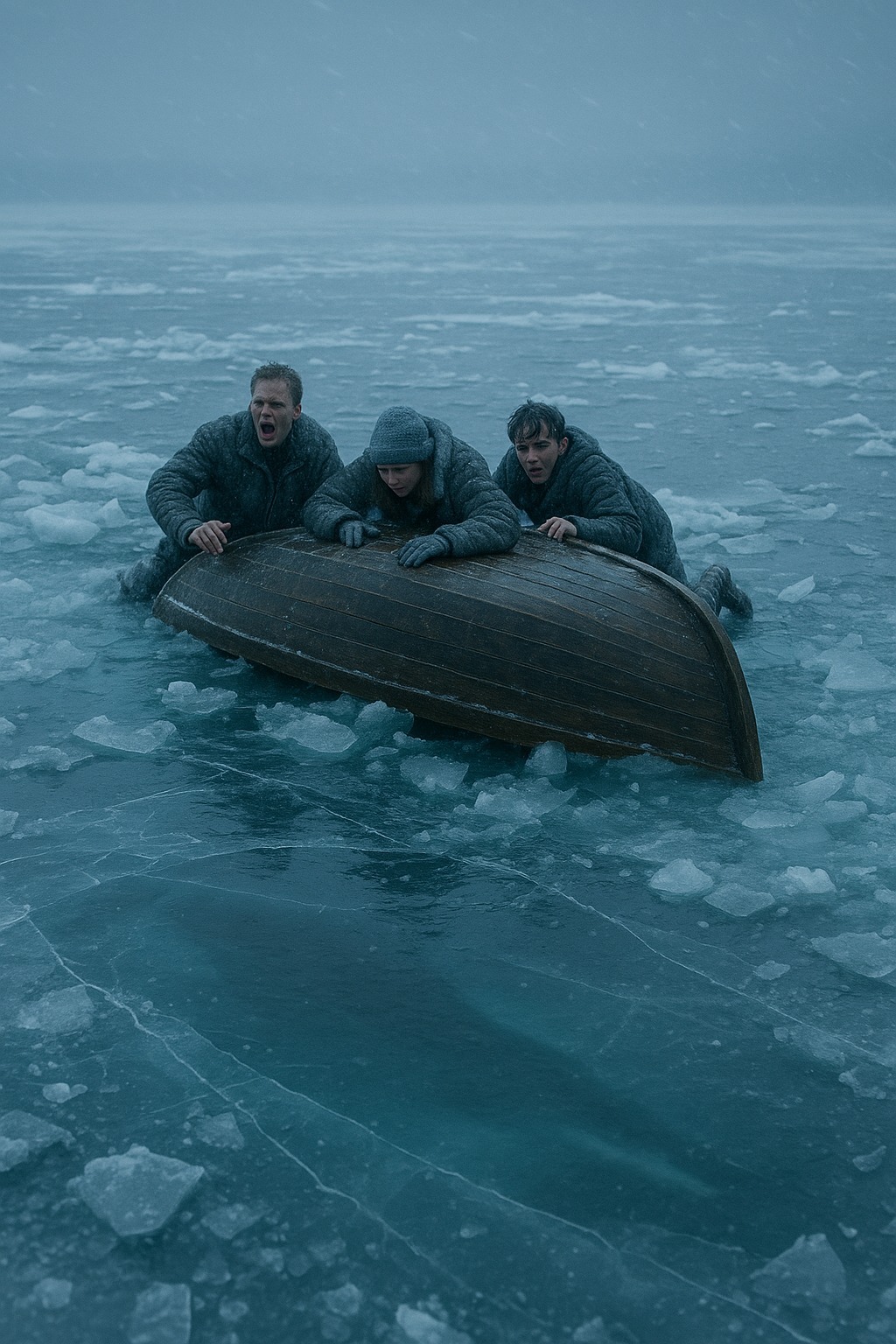 »Båden! Op! Skub båden op på isen!« råbte Mikael, og rystende hænder begyndte at skubbe den væltede skrog. De forsøgte at trække båden op på et tykkere stykke is, selvom de selv stod halvt i vandet. De havde næsten ingen kræfter tilbage. Hvert skub sendte smerter gennem deres muskler. Men skyggen under dem bevægede sig hurtigere.