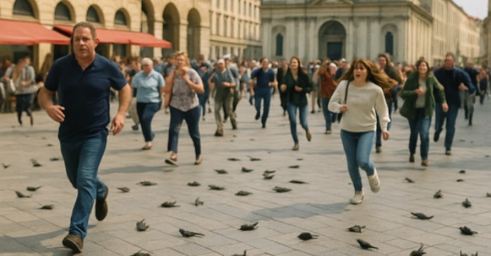 Først så alle én fugl falde fra himlen. Så et par stykker mere. Og efter få sekunder hang der en mørk sværm over pladsen, som hurtigt styrtdykkede. Folk løb i panik til alle sider — det virkede, som om himlen bogstaveligt talt “styrtede ned”.