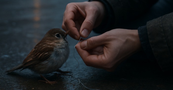 I nærheden, ved skraldespandene, lå en lille spurv på den kolde beton. Våd, rystende, med vingen viklet ind i tynd, skinnende tråd, som vinden havde fanget på containeren. Fuglen kunne knap nok bevæge sig, dens ben rystede, og dens vejrtrækning var hurtig og svag.