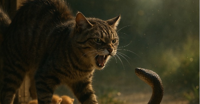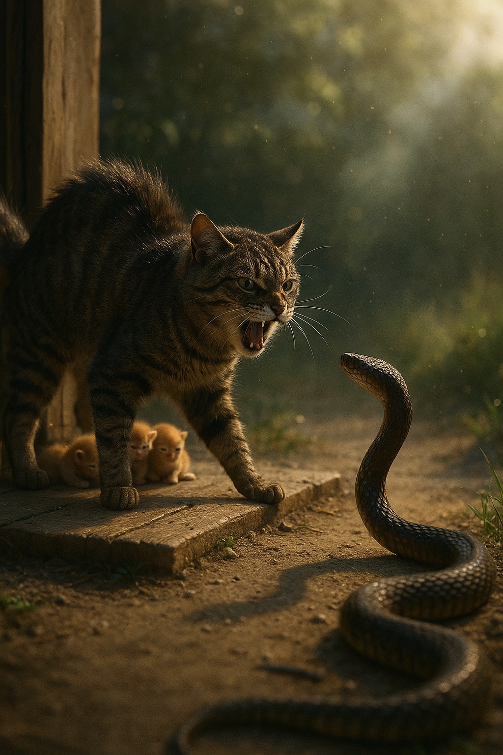 En slange. Mørk, lang, vridende sig — den kravlede langsomt mod det rum, hvor killingerne lå. Dens tunge fløj ud igen og igen, som om den undersøgte luften. Den vidste præcis, hvor den var på vej hen. Katten sagde ikke en lyd. Den rejste sig bare — og stillede sig mellem slangen og killingerne.