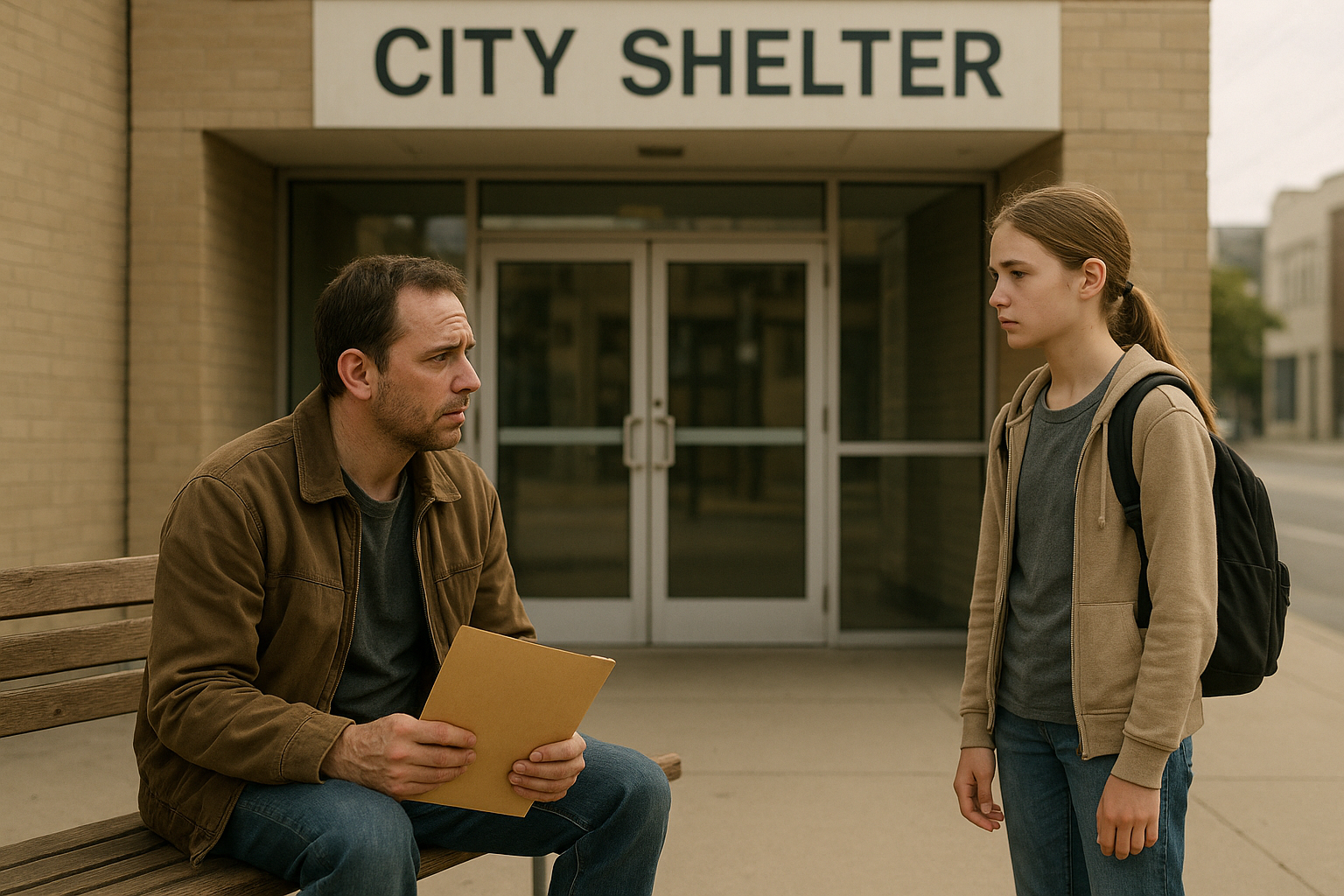 Emma pressede panden mod det kolde ruden i byens herberg, hendes åndedræt efterlod små skyer på glasset. Udenfor, på den slidte træbænk ved indgangen, sad Mark – manden hun stadig tvang sig selv til at kalde far. En tynd mappe rystede i hans hænder. Han kiggede gentagne gange på sit ur, så på døren og tilbage på mappen.