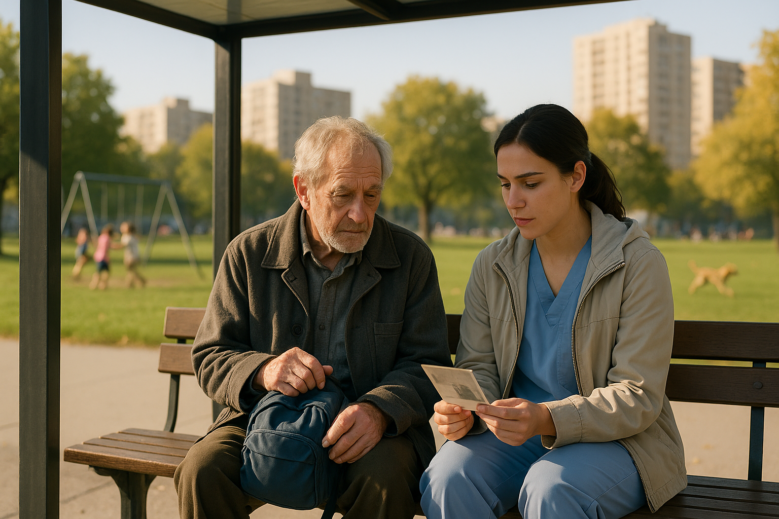 Emma havde lagt mærke til ham i flere uger på vej hjem fra hospitalet. Altid den samme bænk, altid det samme tidspunkt, altid den samme slidte grå frakke og den lille blå rygsæk, som han holdt fast i, som om den rummede noget, der ville forsvinde, hvis han slap grebet.