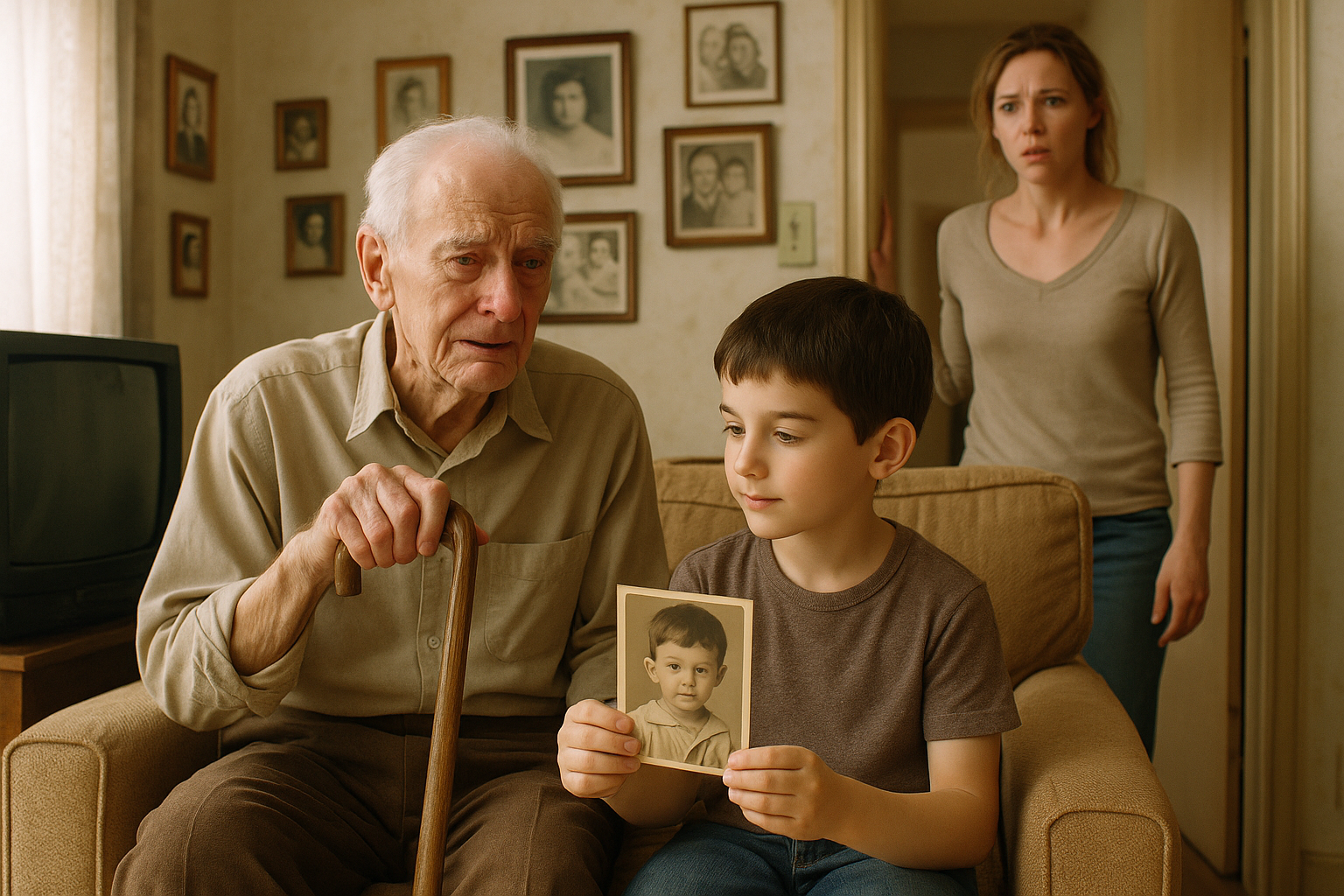 Først ramte lugten — støv, stillestående luft, noget gammelt og glemt. Lejligheden var dunkel men ren, små indrammede fotos dækkede væggene. Og i den slidte sofa sad hr. Harris og min søn side om side.