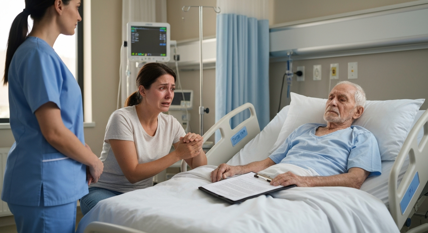 Han tog pennen med rystende fingre. Emmas åndedræt fangede. Afvisningsformularen stirrede tilbage på dem begge: ingen flere operationer, ingen genoplivning, ingen intensiv behandling. Kun komfort.