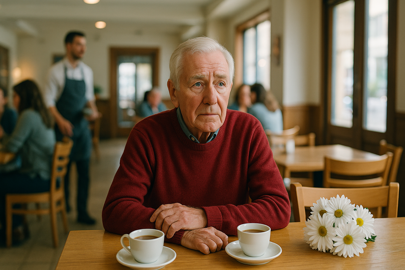 Den gamle mand i den røde sweater sad alene i den fyldte restaurant og stirrede på døren, som om en vigtig person var forsinket, men tjeneren hviskede, at han havde gjort det sådan hver søndag i tre år.