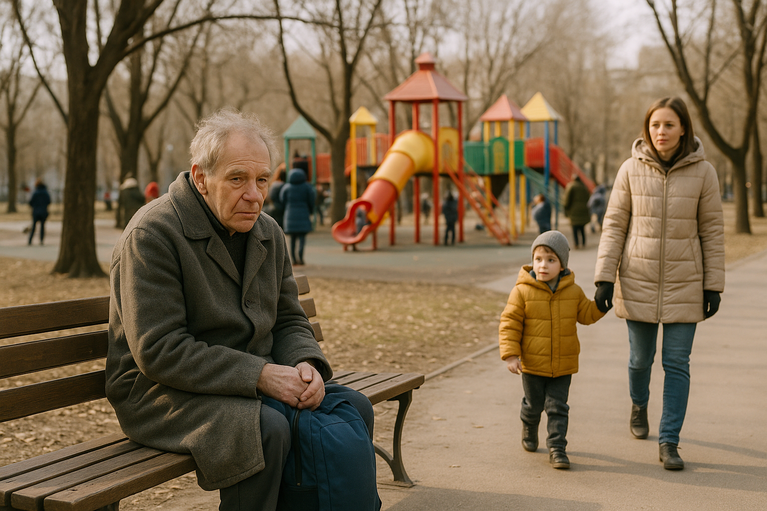 I tre uger gik Emma gennem parken efter arbejde og skubbede sin femårige søn Leo i klapvogn halvdelen af vejen, mens han insisterede på, at han var „for træt” til at gå. Og i tre uger så hun ham: en ældre mand med stok, iført en slidt grå frakke, altid på den samme bænk med udsigt mod legepladsen.