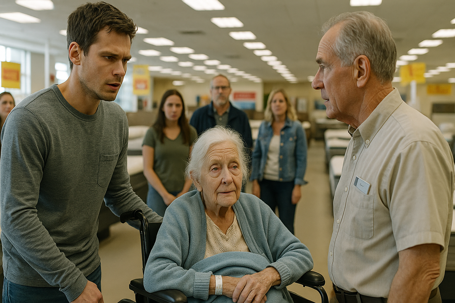 En kvinde ved gardinfremvisningen mumlede akkurat højt nok: “Han køber sig selv en seng, mens hans mor sidder sådan? Utroligt.”