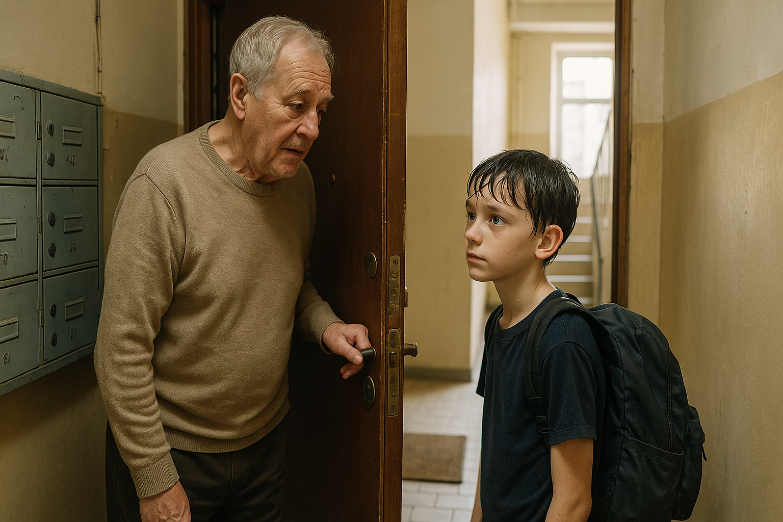 Første gang jeg mødte Liam, var jeg næsten ved at smække døren i hans ansigt. Det var en regnfuld tirsdag, min første uge alene efter min kone Emma var død. Verden uden for min lejlighed føltes alt for højlydt, alt for lys, alt for ligegyldig. Jeg havde lige sat mig med en skål suppe, jeg ikke havde lyst til, da banken kom: tre korte slag, så stilhed.