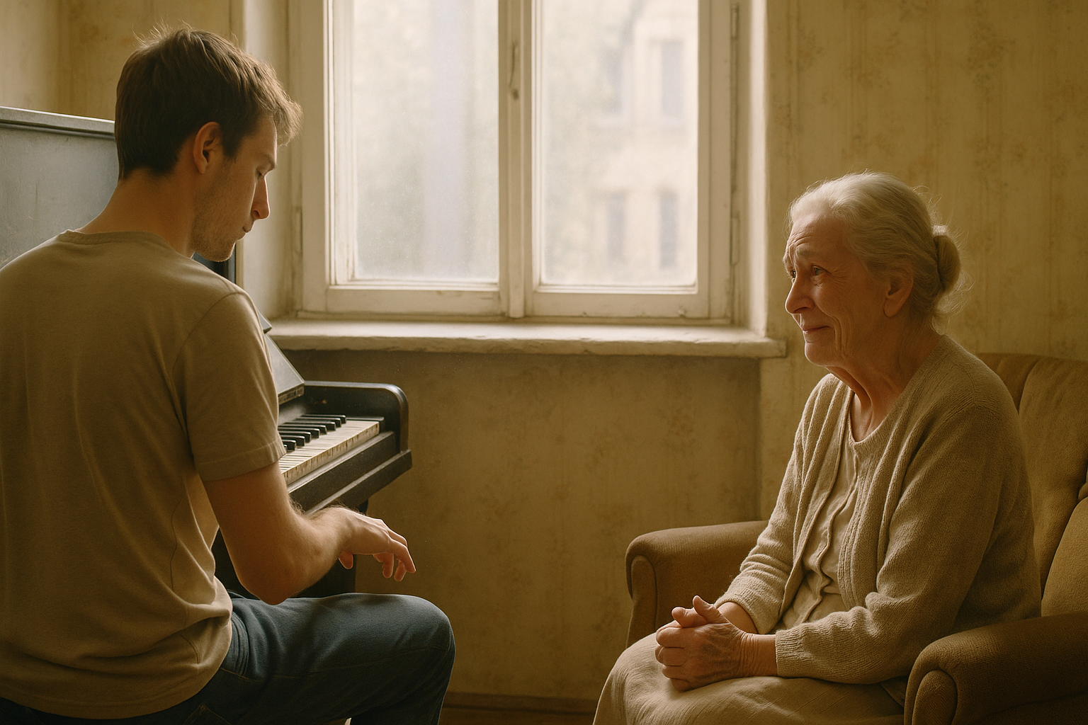 Hun trådte til side for at lukke mig ind. Lejligheden var lille, men smertefuldt ordentlig, alt var på sin plads. På den modsatte væg, ved vinduet, stod et opretstående klaver, dens sorte overflade matteret af tid, og én tangent var flækket i hjørnet.