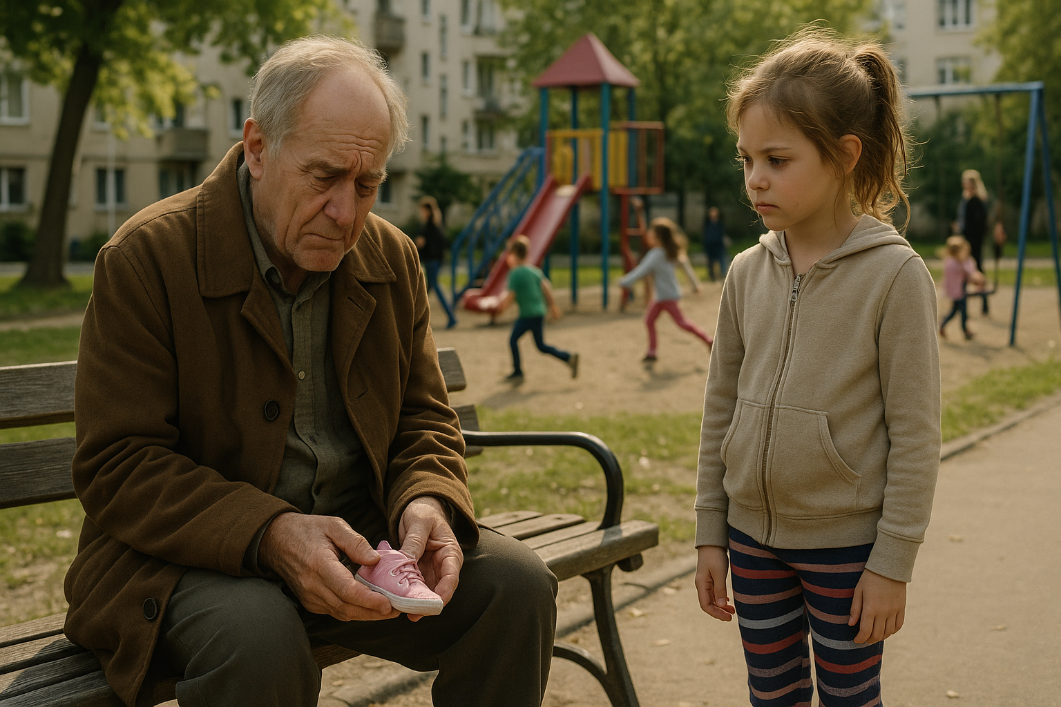 Hans hænder rystede, da han rejste sig. Langsomt, nærmest højtideligt, gik han hen til gyngerne. Børn skiltes om ham, som om de mærkede noget alvorligt. Han knælede og lagde med al den omhu, en mand lægger for en skat, den lille lyserøde sko i den bløde jord under gyngerne fra billedet.