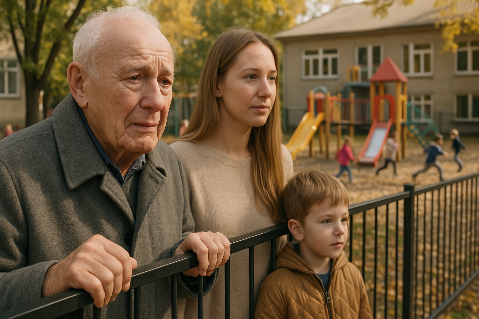 Lærerne havde allerede lagt mærke til ham. Højt, bøjet, i den samme grå frakke, hænder der rystede let, mens han holdt fast i metalrørene ved lågen. Han råbte aldrig, vinkede aldrig, forsøgte aldrig at komme nærmere. Han stod bare der, øjnene fulgte børnene, som om han ledte efter ét bestemt ansigt.