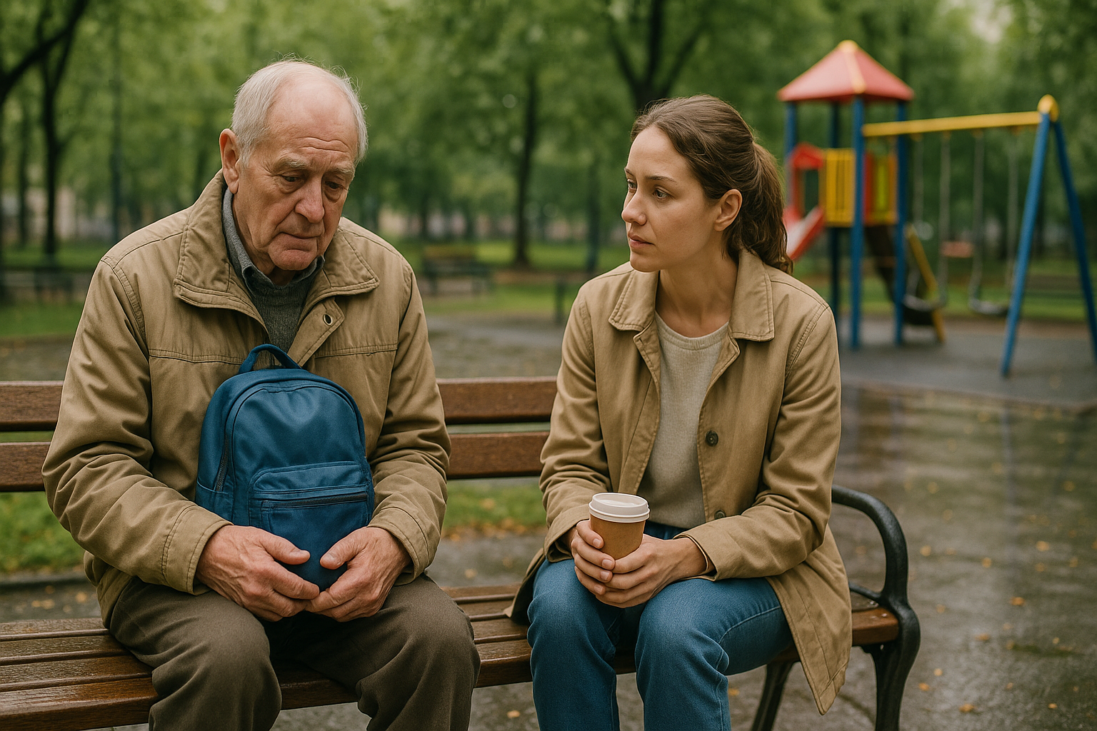 Emma satte sig i den anden ende af bænken, forsigtig med ikke at komme for tæt på. Regnen blev til stille dryp, og parken var næsten tom. “Er det Deres barnebarn?” spurgte hun og nikkede mod sweateren.