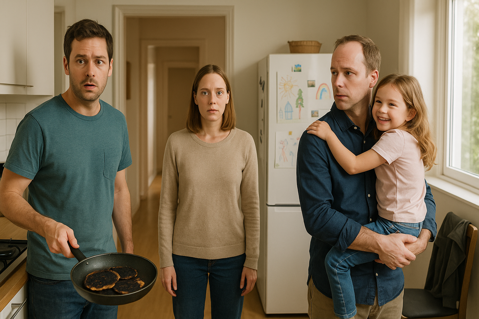 Det var lørdag morgen. Jeg steg pandekager, Emma tegnede ved bordet og vippede med benene. Dørklokken ringede. Min kone, Laura, tørrede hænderne og sagde: “Jeg går og åbner.”