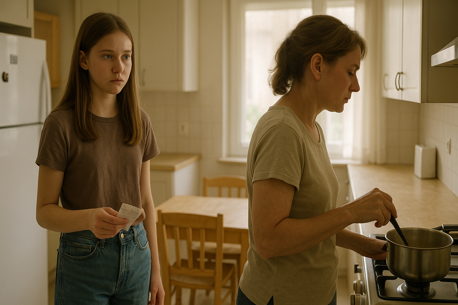 Alt var synligt: tallerkener med krummer på bordet, en højstol, et familiefoto på køleskabet.