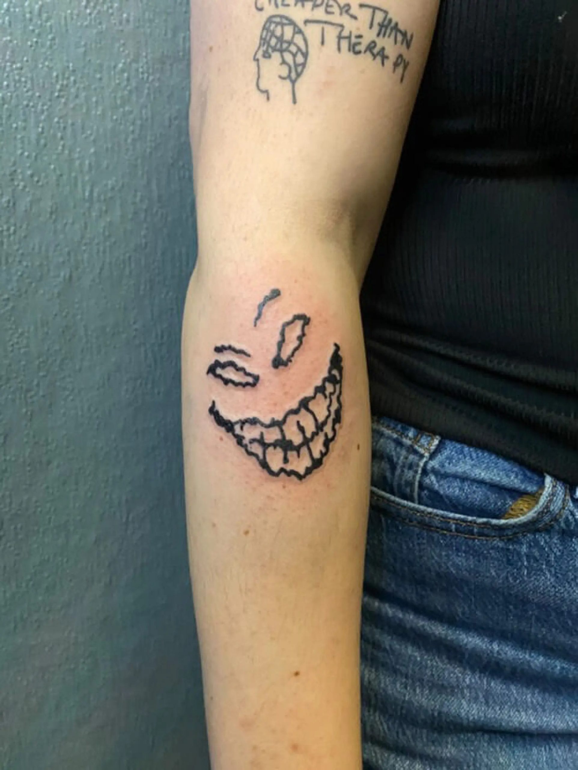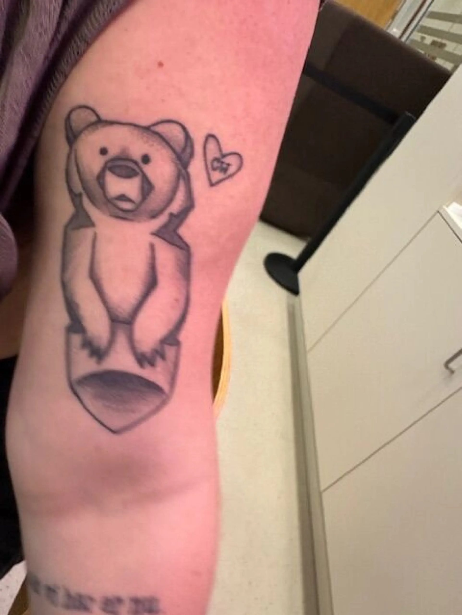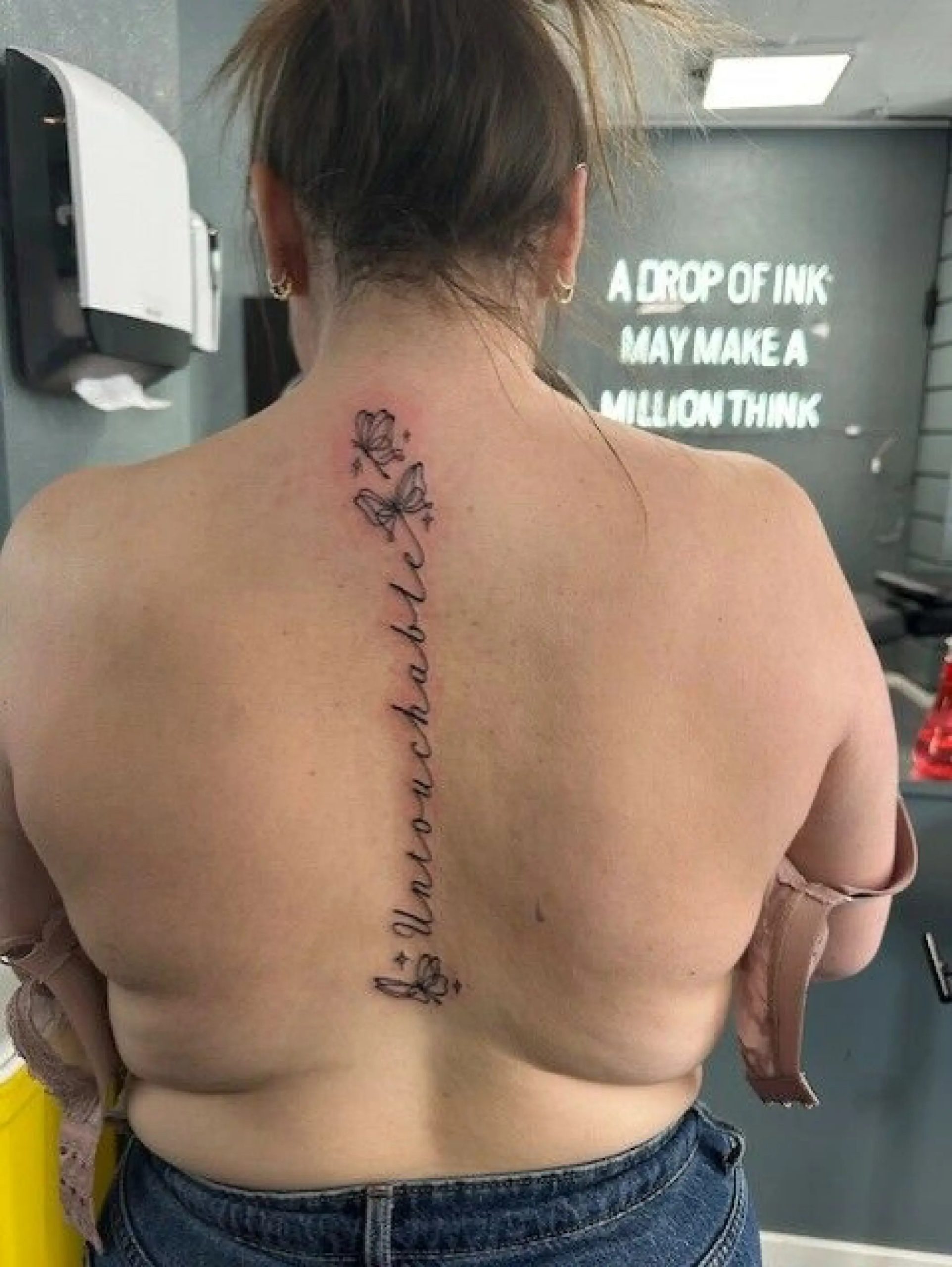 Som et varigt minde har hun ladet sorgen få fysisk form. Få dage efter hans død fik hun tatoveret et lille hjerte med hans initialer. Senere fulgte ordet “Untouchable” langs ryggen – samme tatovering som hendes far bar. Den seneste hyldest er endnu et motiv på armen, inspireret af det rockband, der fyldte hendes barndom. Blæk, smerte og kærlighed – alt sammen en del af historien, hun stadig lever med.